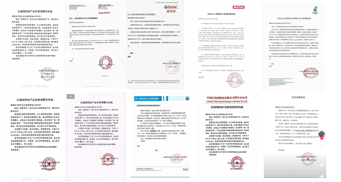 例如美孚和嘉實多,作為“三巨頭”中的兩位,發(fā)漲價函的時間差不多,漲價時間還都是9月1日;而長城潤滑油更是不甘落后,雖然發(fā)布晚了點,但幾家原材料公司和經(jīng)銷公司漲價時間都是8月31日,比美孚、嘉實多提前了1天。