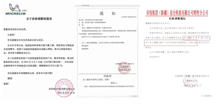 最近幾天,包含米其林、瑪吉斯、昆侖等輪胎品牌均發(fā)布了“9月漲價通知書”;還有倍耐力、固特異、鄧祿普、馬牌等一些輪胎品牌雖沒發(fā)漲價通知,但開始收緊月度促銷、返利政策、上調(diào)開票價格等,等于是變相漲價。