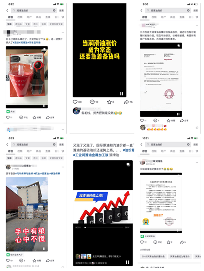 接到各廠家的漲價函后,有機油經(jīng)銷商幾乎立馬發(fā)了朋友圈和抖音:“道達爾也有可能隨時發(fā)漲價函,現(xiàn)在市場很淡,價格很敏感”;“日子已經(jīng)那么難過,大佬又起了頭,這一波預計要很久了。”