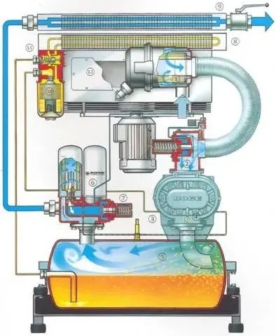 1.進氣過濾器 2.多功能進氣控制閥 3.注油管路 4.壓縮機機頭\轉(zhuǎn)子室 5.油氣預(yù)分離器罐 6.精細油氣分離器 7.最小壓力止回閥 8.油冷卻器 9.壓縮空氣冷卻器 10.油過濾器 11.溫控閥 12.清潔口