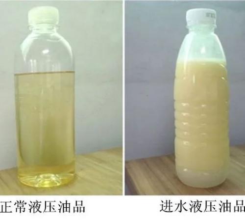 液壓油和水不相溶,且油的密度比水小,當(dāng)油水混合時(shí)在溫度、振動(dòng)、壓力等的作用下,互相包裹形成無數(shù)的微小分隔面,在光的折射作用下顯現(xiàn)白色,肉眼觀察呈奶白色。
